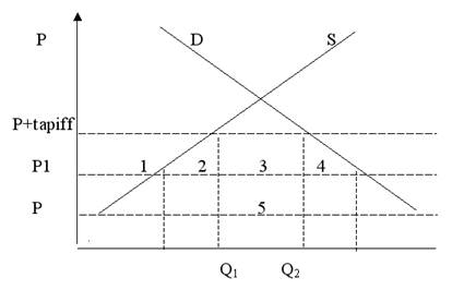 Таким чином, відбулась переорієнтація на виробника, чиї витрати вищі. У результаті споживчий надлишок збільшився на суму (1+2+3+4). Виробники країни Х понесли збитки (1). Втрати бюджету склали – (3+5). Сумарний ефект становить: