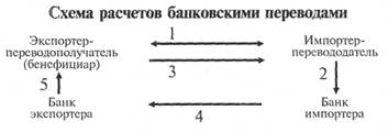 Банковский перевод представляет собой поручение одного банка другому выплатить переводополучателю определенную сумму. В форме банковского перевода осуществляются оплата инкассо, платежи в счет окончательных расчетов, авансовые платежи. Кроме того, посредством перевода производятся перерасчеты и другие операции. В настоящее время банковский перевод осуществляется по системе СВИФТ. Банковские переводы могут сочетаться с другими нормами расчетов (например, с инкассо), а также с гарантиями. Экспортер предпочитает сочетать переводы с гарантией банка, который в случае неоплаты товара импортером производит платеж в счет гарантии. Для осуществления перевода за товары импортер часто прибегает к банковскому кредиту, срок которого короче, чем по кредиту для открытия аккредитива.