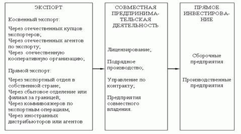 Формирование стратегии интернационализации предприятия предусматривает выбор способа выхода на внешние рынки. Существует несколько способов проникновения на иностранные рынки, из которых компания, проанализировав все внешние и внутренние факторы, выбирает наиболее подходящий для себя. Предприятие может остановиться на экспорте, совместной предпринимательской деятельности или прямом инвестировании за границей (рис. 2.1).