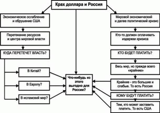Между тем крах доллара в ушедшем в прошлое биполярном мире, где второй стороной, альтернативным полюсом, являлся СССР, — это был, согласно классикам, путь к мировой революции или к мировой войне. Тот СССР был способен в случае краха доллара и катастрофического ослабления США (то есть в случае, если прочность экономической и политической системы "империалистов" резко снизилась) нести туда "пожар мировой революции". На что эти самые империалисты могли ответить только ядерной войной (которую, как известно уже с 70-х годов, начинать нельзя, потому что это будет означать полное уничтожение всего мира). И тогда было понятно, зачем России крах доллара и ослабление США: речь шла о мировой революции и перехвате СССР мирового господства.
