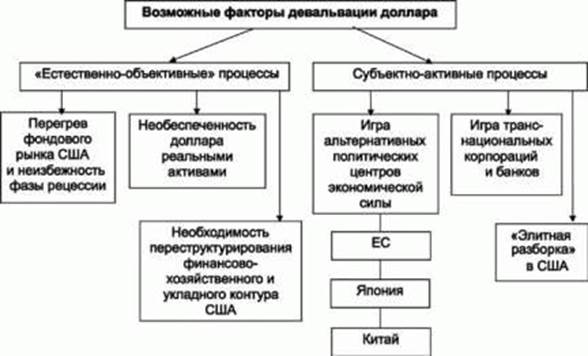 Теперь попытаемся рассмотреть, из-за чего же может быть девальвирован (или, тем более, может рухнуть) доллар? Каковы факторы, которые на это влияют? Сначала мы их просто сгруппируем и перечислим (см. рис.4), а затем перейдем к более детальному рассмотрению.