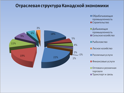 Впечатляющий рост производственного, горнодобывающего секторов и сферы услуг превратил почти полностью аграрное государство в преимущественно индустриальное с преобладанием городского населения. Как и в других современных промышленно-развитых странах, в канадской экономике преобладает сфера услуг, в которой занято ¾ канадцев. Однако Канада отличается от других промышленно-развитых стран важным положением добывающей промышленности в её экономике, в частности, её нефтяной и лесной отраслей.