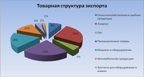 Товарная структура импорта распределилась следующим образом: 28% всего импорта приходится на машины и оборудование, что составляет 122,6 мил. дол, 21% на промышленные товары – 91,6 мил. дол, 16% автомобильную продукцию – 71,96 мил дол, 21% – на энергию – 53,07 мил. дол.