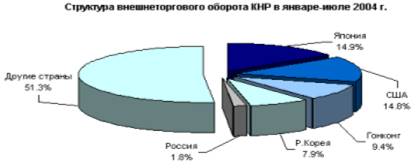 Во внешнеэкономических связях КНР успешно реализуется политика «открытой экономики», характеризующаяся многообразием форм привлечения иностранных инвестиций как в приморские, пограничные, так и во внутренние районы страны. По объему внешней торговли в 1997 г. Китай вошел в первую десятку стран мира, став третьим крупнейшим экспортером и имеет устойчивое крупное положительное сальдо торгового баланса. Главные торговые партнеры – Япония, США, Республика Корея. Германия, страны Юго-Восточной Азии, Россия.