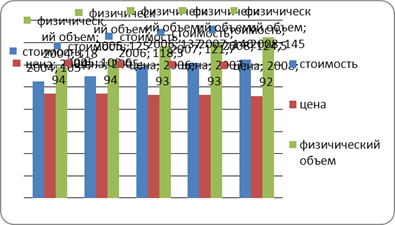 Диаграмма 2. - Индексы стоимости, физического объема и экспортных цен в 2004-2008 годах в процентах к 2000 году.