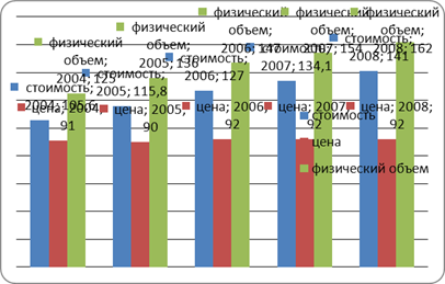Диаграмма 3. - Индексы стоимости, физического объема и экспортных цен в 2004-2008 годы в процентах к 2000 году.