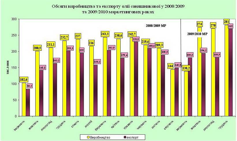 В табл.1.1 наведений баланс попиту і пропозиції олії соняшникової в Україні у 2009/2010 МР (тис. тон) [47]. У 2009/2010 МР виробництво насіння соняшнику склало 6,4 млн. тон, що дасть змогу повною мірою задовольнити потреби внутрішнього ринку та виробити близько 2,4-2,5 млн. тон олії. Внутрішнє споживання олій рослинних у перерахунку на рік оцінюється 14,2 кг на особу (раціональна норма 13 кг на особу на рік). Експортні можливості у поточному маркетинговому періоді оцінюються у межах 2,0-2,1 млн. тон. Питома вага України у світовому виробництві соняшнику та олії, виробленої з нього, складає близько 15%. За попередніми даними у 2008/09 маркетинговому році виробництво олії соняшникової склало 2498 тис. тон. За вересень-листопад 2009/2010 МР –964,5 тис. тон (табл.1.2) [46].