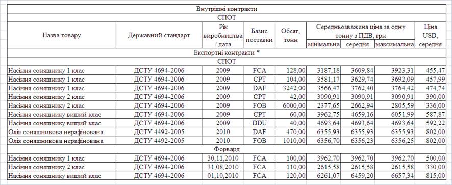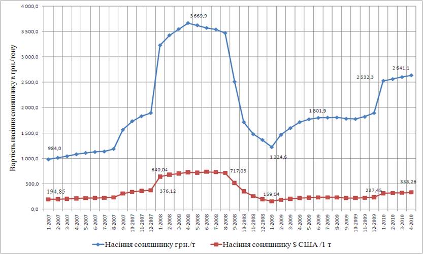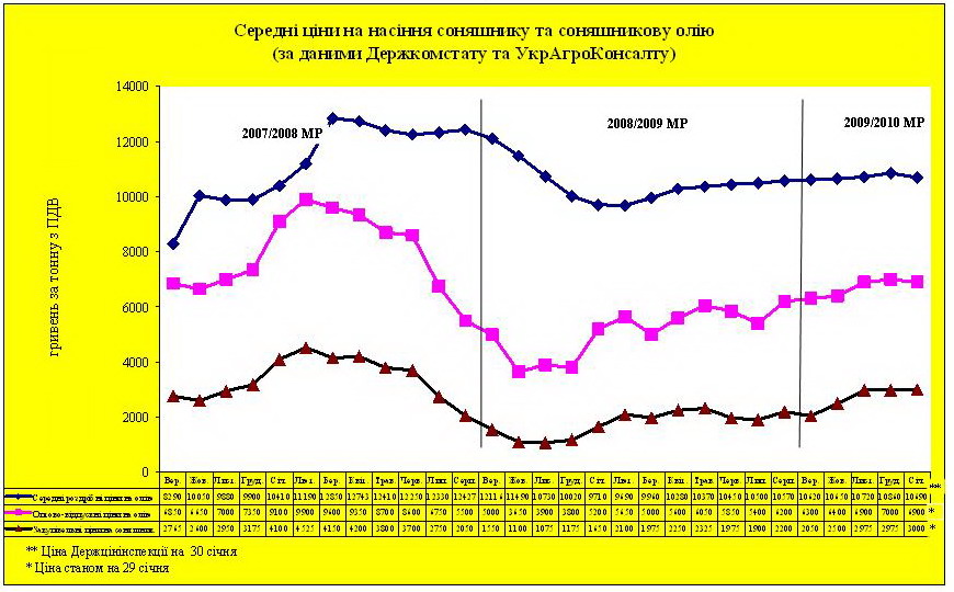За даними УкрАгроКонсалту ціна на соняшник у 2009/2010 МР станом на 29.01.10 становила 3000 грн./тонну проти 1650 грн./тонну у відповідному періоді минулого 2008/2009 маркетингового року, на олію у 2009/2010 МР –6900 грн./тонну проти 5200 грн./тонну у минулому 2008/2009 МР [47].
