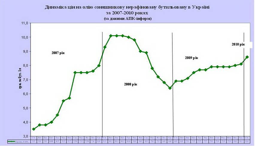 Рис.1.3 Динаміка цін внутрішнього ринку України на упаковану в 1л ПЕТ-пляшки нерафіновану сонящникову олію у 2007 – 2010 рр. [46]