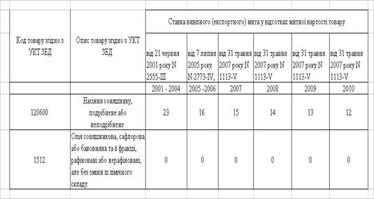 Довідково: з 1 січня 2009 року вивізне мито на насіння соняшнику становило 13%, з 1 січня 2010 року вивізне експортне мито на насіння соняшнику становить 12 % [43].