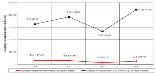 Україна посідає провідне місце на світовому ринку з продажу олії соняшникової. При цьому 90% від загального експорту складає олія неочищена. За попередніми даними у 2008/2009 МР експортовано 2099 тис. тонн олії соняшникової, що на 57% більше проти відповідного періоду минулого року.