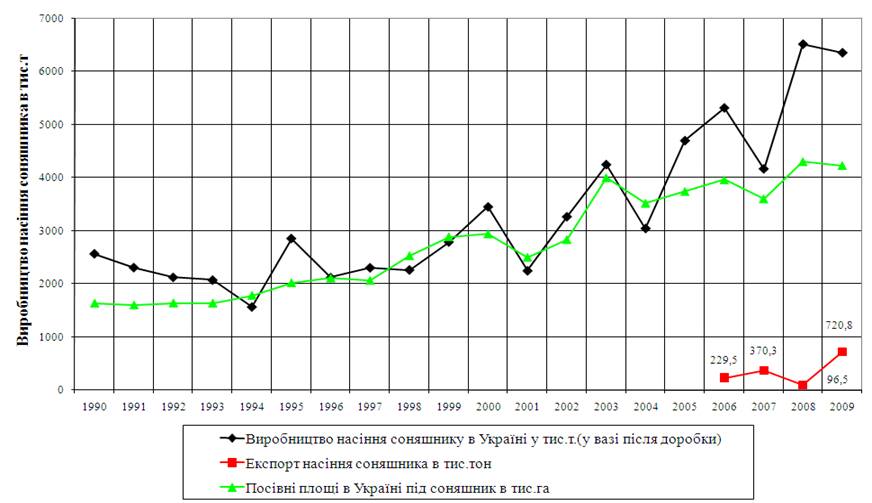 На сьогодні Україна є одним з основних світових виробників насіння соняшнику. Виробництво соняшнику у 2008/2009 МР в усіх категоріях господарств становило 6,5 млн. тонн у вазі після доробки, у 2009/2010 за попередніми даними зібрано 6,4 млн тонн., що становить 97,5% до попереднього МР (табл.1.3).