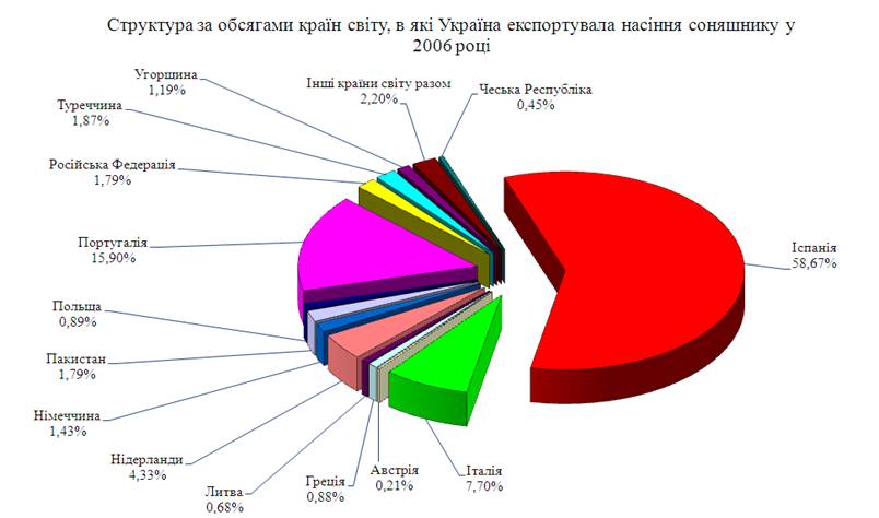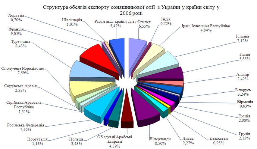 Найбільшими імпортерами нерафінованої олії у 2008/09 МР стала Індія – 25% від обсягів загального експорту з України, Туреччина – 13%, Єгипет – 8,3%. Серед країн ЄС: Франція – 5,7%, Італія – 5,2%, Нідерланди – 4,6%, Іспанія – 4,5% від обсягів загального експорту з України [43].