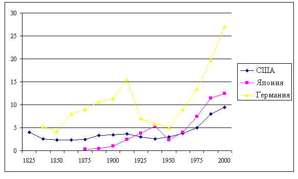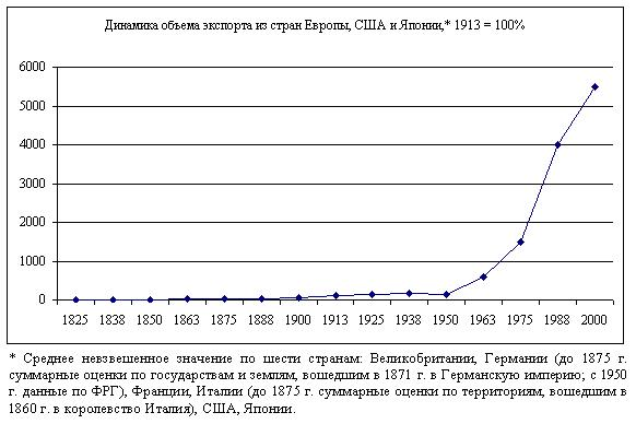 Главная тенденция формирования транснациональной экономики – это интенсификация товарных и финансовых потоков, идущих через границы национальных государств. Качественный рост, уникальная по своим масштабам и влиянию на экономику "революция" международной торговли произошла в XX в. (См. приложение 1).Динамика объема экспорта из развитых стран на протяжении XIX - XX вв. (См. приложение 2) носит характер сдвига: относительно медленный рост, затем спад и сразу вслед за спадом беспрецедентный рост. Значительная доля этого роста обеспечена развитием транснациональных корпораций, поскольку от 33% [1, p. 96] до 40% [2, p. 377] международной торговли - это внутрифирменная торговля, то есть передача необходимых для производственных процессов комплектующих из одного подразделения ТНК в другое.