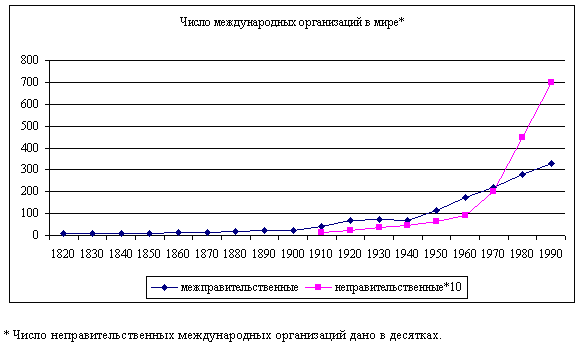 Другая тенденция – это формирование сферы транснациональной политики. В начале - середине XX в. параллельно "революции" международной торговли и возрастанию роли ТНК происходила "революция" международной бюрократии, выразившаяся в беспрецедентном росте числа как межправительственных, так и неправительственных международных организаций (См. приложение 3). Динамика количества международных организаций воспроизводит общую модель сдвига: вялый рост, затем - падение темпов роста и даже абсолютное уменьшение и после спада - резкий подъем.