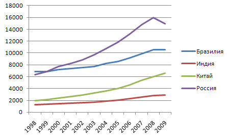 Динамика ВВП на душу населения в странах БРИК в 1998—2009 годах, в долларах США
