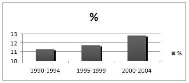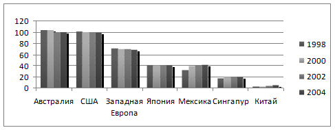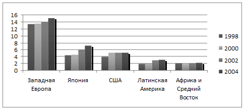 Рисунок 2 – Среднегодовой рост розничных продаж молочных продуктов, 1998–2004 гг.[5]