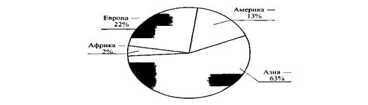 До 60-х гг. XX в. самым массовым было кооперативное движение Европы. На начало XXI века (2002 г.) центр кооперативного движения переместился в Азию. Общее количество членов кооперативов, имеющихся в мире, распределилось по континентам следующим образом: Азия — 63%, Европа — 22%, Америка — 13%, Африка — 2% [13, С.143] (рис. 1).