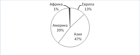 Рис.1 Удельный вес членов кооперативов по континентам (в % к общей численности кооперативов, имеющихся в мире) на 2002 год