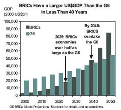Голдман-Сакс утверждает, что экономический потенциал Бразилии, России, Индии и Китая таков, что они могут стать четырьмя доминирующими экономическими системами к 2050 году. Тезис был предложен Джимом O’Нилом, глобальным экономистом в Голдман-Сакс. Эти страны занимают более чем 25 % суши в мире, 40 % населения и имеют объединённый валовой внутренний продукт (ВВП) 15.435 триллионов долларов. Почти в каждом сравнении они будут наибольшим глобальным объектом. Эти четыре страны среди самых больших и наиболее быстро растущих формирующихся рынков. Однако, важно отметить, что Голдман-Сакс не утверждал, что эти четыре страны создадут политический союз (такой как Европейский союз или любая официальная торговая ассоциация, как АСЕАН). Тем не менее, эти страны предприняли шаги по увеличению своего политического сотрудничества - главным образом ради влияния на положение Соединённых Штатов в основных торговых соглашениях или, через неявную угрозу политического сотрудничества, как способ извлечь политические выгоды из Соединённых Штатов - такие как предложенное ядерное сотрудничество с Индией.