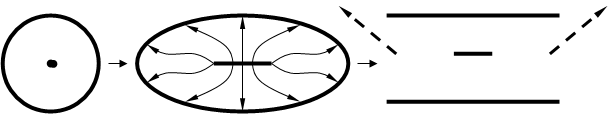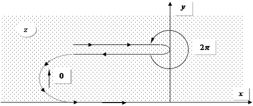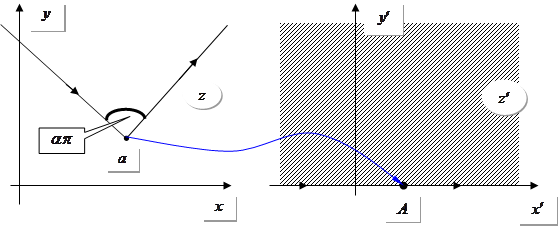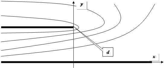 Треба розв’язати задачу: знайти розв’язок рівняння Лапласа у верхній площині з напівнескінченним розрізом. Використаємо метод конформних відображень: тут застосовується інтегральне конформне перетворення Кристофеля – Шварца.
