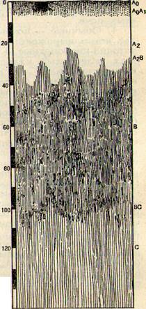 Подзолистые почвы с поверхности имеют подстилку (А0 ) мощностью от 2—5 до 10 см. Ниже расположен слаборазвитый гумусовый горизонт, представленный слоем грубого гумуса в 1—Зсм (А0 А1 , или фульватный гумус вмыт из подстилки на глубину 3—5 см (А1 А2 ). Под слаборазвитым гумусовым горизонтом залегает подзолистый (А2 ), затем иллювиальный (В), который подстилается породой (С) (рис. 35). Между подзолистым и иллювиальным горизонтами выделяется переходный горизонт А2 В, а между иллювиальным и породой — ВС. По степени выраженности иллювия горизонт В может быть подразделен на несколько подгоризонтов — В1 , В 2 и т. д. Мощность профиля почвы достигает 100—120 см. Верхние горизонты сильнокислые рНкс l 3,3—4). Формируются подзолистые почвы главным образом в среднетаежной подзоне.