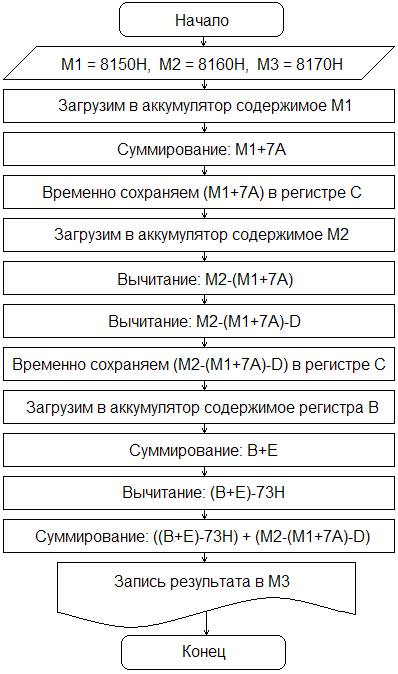 Найти значение функции M3=(B+E-73H)+M2-(M1+7AH)-D