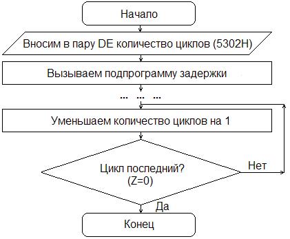 В результате общее количество тактов будет: 24(один цикл) ·21250 + 10( RET) – 3( JNZ) + 10( LXI) + 17( CALL) = 510034 тактов.
