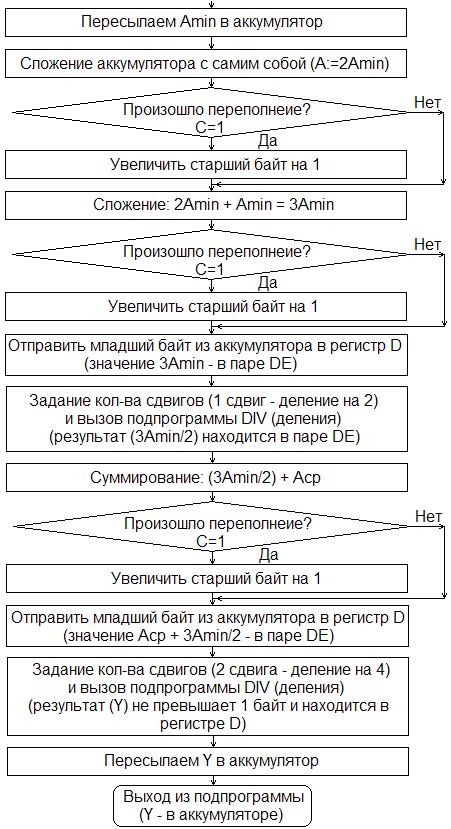 <!-- так как среднее значение (АСР ) не превышает один байт, то оно находится не в паре DE, а в регистре D; это значение будет переправлено в регистр Н (пара HL уже не используется), чтобы освободить пару DE -->