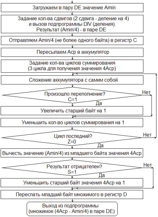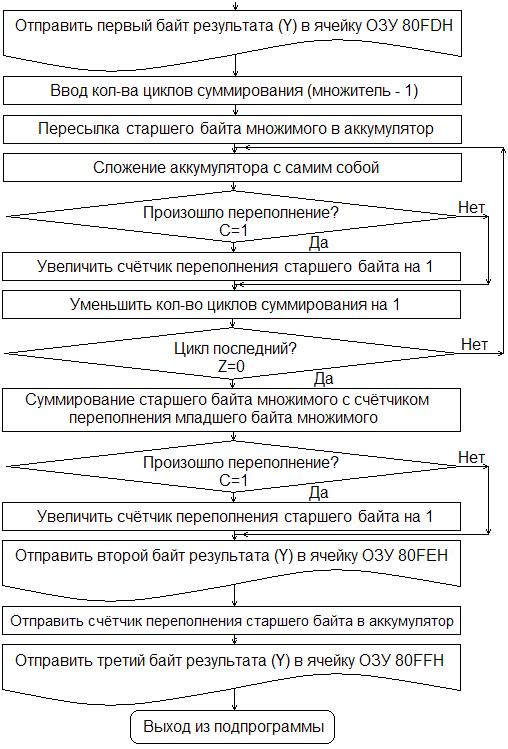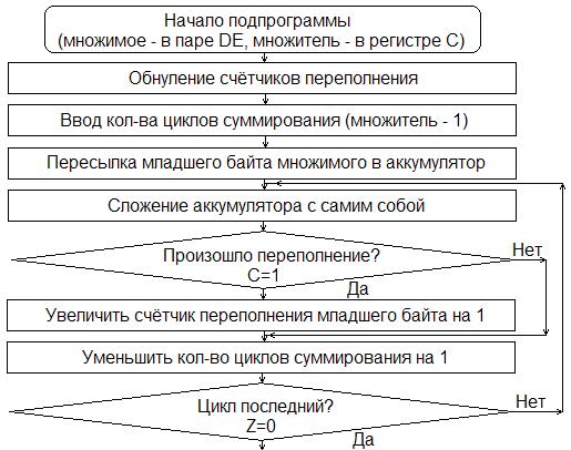 <!-- Операция умножения реализована посредством многократного суммирования (кол-во циклов суммирования = множитель-1). Поскольку множимое состоит из двух байт (находится в паре DE), то суммирование производится сначала для младших байтов (счётчик переполнения – в регистре H), а потом для старших байтов (счётчик переполнения – в регистре L). Таким образом, первый (младший) байт Y находится в регистре D, второй байт – состоит из суммы старшего байта множимого (E) и счётчика переполнения младшего байта множимого (H), третий (старший) байт – в регистре L -->