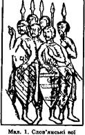 На початковому етапі східнослов'янської цивілізації воєнна організація була родоплемінною. Саме рід дбав про зброю та військове спорядження, забезпечував охорону осель, городищ від ворогів. Усі важливі воєнні справи (ведення війни, укладення миру) вирішувалися на вічі. Не було ніяких рангів чи ступенів. Керував воями (мал. 1) в бою воєвода або князь. Озброєння було різноманітним: списи різних видів (по два-три у кожного), сокира, лук (він був відомий слов'янам здавна, проте не мав такого поширення, як, наприклад, у степових народів). Пізніше слов'яни запозичили у готів меч. У ближньому бою використовували короткий ніж. Тіло захищали щитом. Кидали каміння за допомогою пращі. До бою військо йшло пішим ходом.