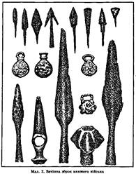 шолом, щит, меч, спис, сокиру (мал. 4). Стрільці, або ж лучники, були озброєні тільки луками та стрілами. До кінця XI ст. українське військо було пішим. Головною ударною силою виступала важкоозброєна піхота (у панцирах, із щитами, списами). Кінноту вперше використали Олег та Ігор у X ст. у походах на Візантію, на греків. Кіннота підрозділялася на важку (воїни у панцирах, шоломах, зі списами і щитами) і легку (стрільці з