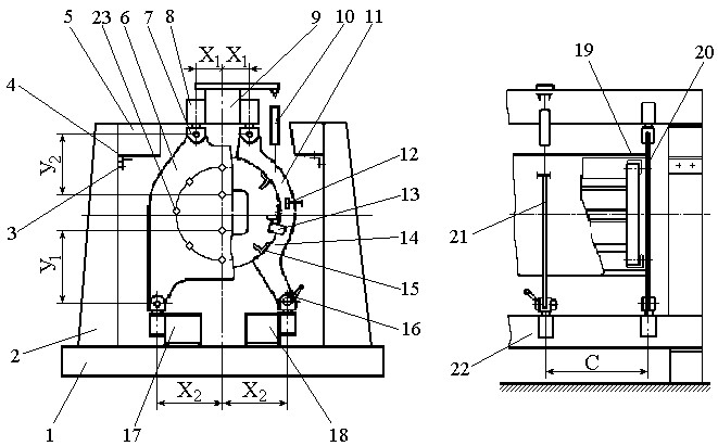 Поворот рамы 2 относительно оси ох обеспечивается с помощью гидравлического двигателя 13 и шариковинтовой пары 14. Рама смонтирована на двух шаровых опорах 15 вертикальных кареток. Тележки поддерживающего устройства скреплены между собой тягами. Движениями по осям ох и оу управляет система ЧПУ типа НЗЗ. Для поворота вокруг осей ох и оу по верхней головке скобы смонтированы следящие щупы контроля поверхности, которые устанавливают зону обработки панели перпендикулярно оси клепки. Датчик контроля перемычки устанавливается на нижней головке.