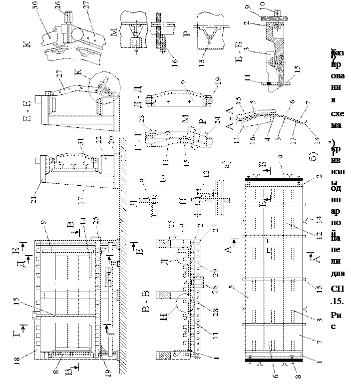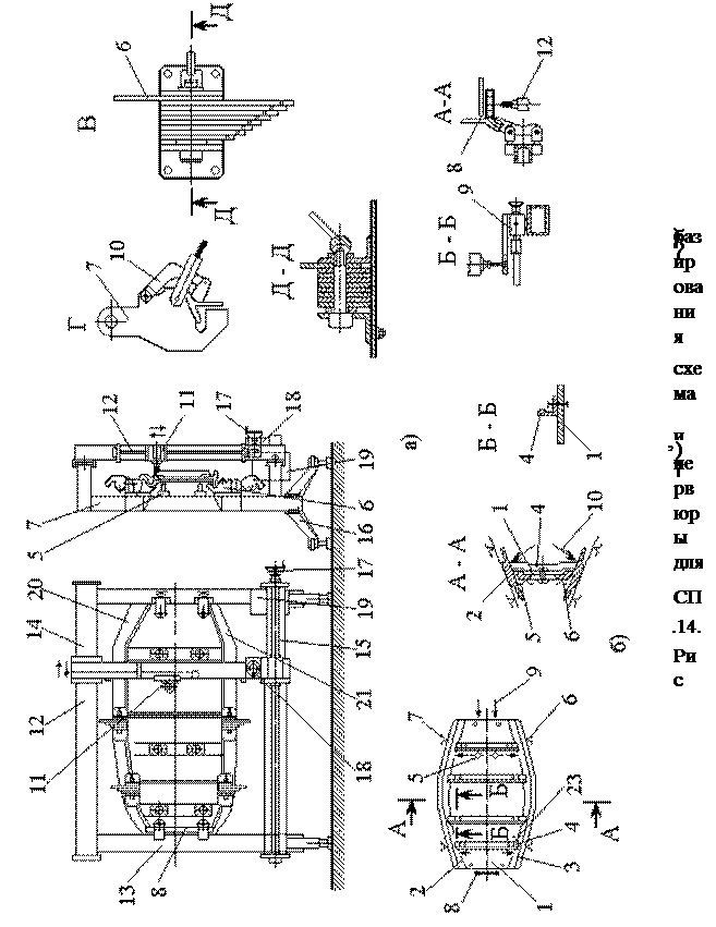 Станина 1 состоит из колонн и балок, на которых монтируются все основные узлы установки. Внутри колонн размещены противовесы, позволяющие разгрузить привод выравнивающего устройства. На боковых колоннах расположены блоки выравнивания, корректирующие положение панели относительно агрегатов СЗА-03, на малых — установлены направляющие для сверлильных агрегатов.