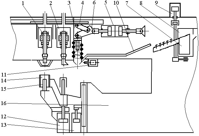 В верхней головке расположены сверлильный шпиндель 1, зачистной шпиндель 2 и шпиндель вставки заклепки 3, закрепленные на общей каретке 4. Перемещение каретки осуществляется сдвоенным пневматическим цилиндром 5 через коленно-шатунный механизм 6. Шибер 7 бункерного устройства 8 приводится в движение пневматическим цилиндром 9 (остальные бункеры на рисунке не показаны). Ориентированные заклепки по путепроводу 10 поступают к досылателю 11 и далее — в механизм вставки.