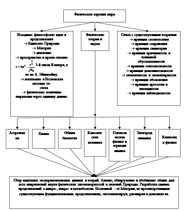 Процесс познания единственной Природы шел путем разделения Ее изучения на множество не связанных между собою областей исследования (научных направлений), породивших множество недостоверных теорий и как следствие - излишней терминологии. Среди множества теорий устойчивыми и частично адекватными законам Природы оказались теории четырех областей изучения: классическая механика, статистическая физика, электродинамика и квантовая физика. Создание существующей картины Мира можно отобразить в виде следующей схемы, путём отказа от существующего стиля мышления и от сугубо математических методов разработки физической теории, используя диалектический метод познания с привлечением (выбора) математики, адекватных законам Природы.