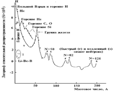 В любой ассоциации количество микрообъектов, приходящееся на каждое значение габаритов в объединении, распределено по закону распространенности химических элементов N (r), что не противоречит экспериментальной распространенности химических элементов. (смотрите на графике сверху теоретическая кривая в линейном масштабе, а справа экспериментальная кривая в логарифмическом масштабе, а на оси абсцисс вместо габаритов - массовое число, которое пропорционально габаритам r0 3 )