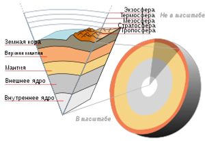 Сама Земля в форме не очень выраженного застывшего сферического вихря (смотри рис. слева ) подобно репчатому луку или кочну капусты, состоит из 8-ми оболочек (шаровых слоев), вложенных одна в другую, составляя внешнее ядрышко (смотри рис. справа ). В центре земных недр размещается очень плотное, массивное, но чрезвычайно горячее внутреннее ядро радиусом 25,5м. Внутри этого ядра содержаться еще 15 ядрышек каждое из них по 8 оболочек с веществом находящимся в особом неизвестным науке состоянии, возможно: - "черной дыры". Температура, плотность вещества и давление от центра земных недр к периферии непрерывно уменьшаются, достигая конечных значений температуры около 4о С, плотности около 2,7т/м3 и давление 1атмосферу.