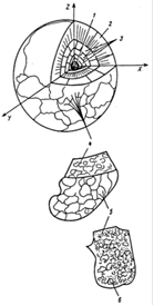 В свою очередь каждая континентальная плита состоит из менее габаритных геологических формирований, любая из которых состоит из еще меньших объектов твердого вещества: зерен ® кристаллов ® молекул ® атомов и т.д. В промежутках между ними размещаются микрообъекты газообразного вещества и элементарные частицы: протоны ® электроны ®позитроны ®g-фотоны и т.д., а также микрообъекты эфира Вселенной. Структура всех последующих внутренних оболочек аналогична верхней оболочке, но максимальные крупности геологических формирований по мере приближения к центру Земли на каждой оболочке уменьшаются в 27 = 128 раз. Габариты (крупности) микрочастиц во внутреннем ядре Земли чрезвычайно малы менее 2×10-34 м.