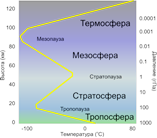Над поверхностью Земли как продолжение её физического поля простирается атмосфера, состоящая из смеси газов - воздуха, которым все организмы дышат. Также как недра Земли атмосфера структурна, и с удалением от поверхности Земли обнаруживает следующие оболочки: - тропосфера нижний шаровой слой до ~ 10км., затем до высоты ~ 50км. - стратосфера, шаровой слой до высоты 75км. Мезосфера, и далее ионосфера постепенно переходящая в космическую среду, в которой также имеются оболочки. На различных высотах в тропосфере концентрическими слоями располагаются облака, в которых возникают вихри, переходящие в циклоны, а иногда в тайфуны, торнадо и смерчи. С удалением от поверхности Земли плотность и давление атмосферы непрерывно уменьшаются, а вот температура сначала в тропосфере уменьшается, а в стратосфере наоборот увеличивается до границы с мезосферой, в пределах которой до ионосферы вновь уменьшается. В ионосфере температура непрерывно увеличивается и продолжает медленно увеличиваться в космической среде. Химический состав атмосферы по мере удаления от Земли непрерывно изменяется от тяжелых газов к легким - к гелию, а затем к водороду, к протонам, к электронам и фотонам с широким спектром электромагнитных волн излучения абсолютного черного тела с температурой 255о К вместе с гравитационным полем.