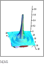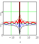 На рис. слева - показана проекция расположения оболочек на плоскость большого круга собственного шара ОФМ. В центре график волны в трехмерном виде. На рис. справа - график волны вдоль радиус вектора. .
