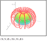 Показан диполь Солнечной системы с наложенным на него графиком диполя. Ниже слева показан трехмерный тор и его разрез в виде диполя.