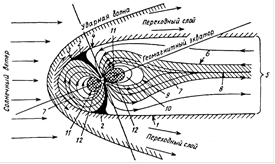 Справа диполь Земной системы, деформированная солнечным ветром.