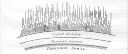 Объемный вихрь состоит из неисчислимой совокупности микрообъектов различных габаритов, поэтому вследствие всемирного закона объединения в ассоциации и размежевания между ними сначала возникают цуги фантомных концентрических облаков, как из микрообъектов, испускаемых из центра Земли: