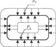 Возьмем замкнутый сосуд и создадим в нем избыточное давление Рк. На сосуд будет также действовать сила атмосферного давления Рн окружаю-шея среды, рис. 1.