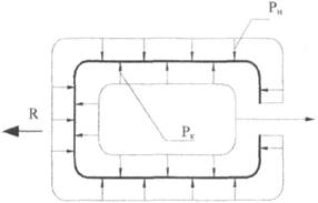 На поверхность сосуда также действует сила, зависящая от величины давлений, воздействующих на его внутреннюю и наружную поверхности, т.е.