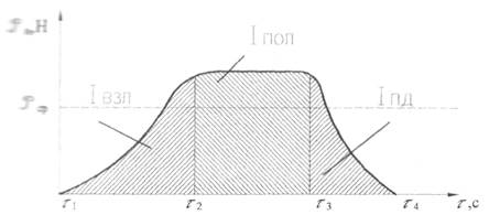 Вышеприведённый вывод формулы тяги осуществлялся при условии её постоянства во время работы двигательной установки. Однако на практике это не соответствует действительности. На рис.7 приведена зависимость тяги двигательной установки от времени её полёта. (Iвзл, Iпол, Iпд - значения импульса ДУ на режимах взлёта, полёта и выключения, Iпд- импульс последействия).