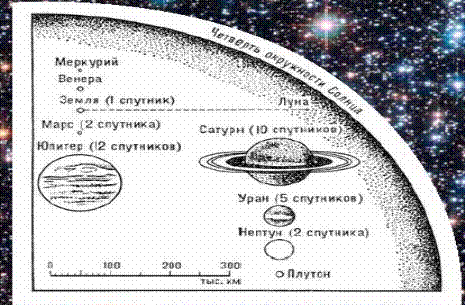 Планеты находятся на разных расстояниях от Солнца и вращаются вокруг него по эллиптическим орбитам с разной скоростью, в одном направлении и почти в одной плоскости. Они расположены в следующем порядке от светила: Меркурий, Венера, Земля, Марс, Юпитер, Сатурн, Уран, Нептун, Плутон. Плутон иногда удаляется от Солнца более чем на 7 млрд. км, но остаётся в сфере его притяжения из-за огромной массы Солнца, почти в 750 раз превышающей массу всех остальных планет.