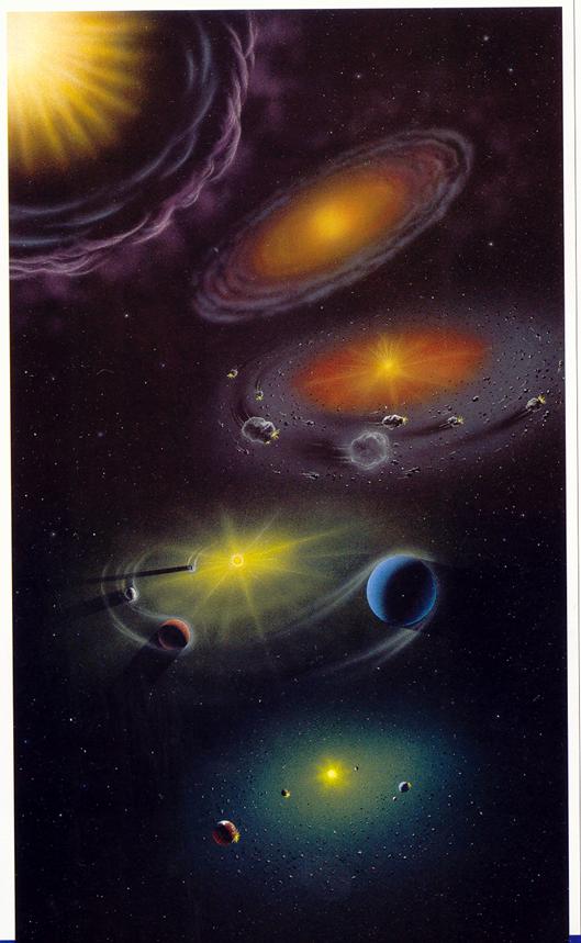 Солнце и планеты произошли из сплющенной раскалённой газопылевой туманности. Гигантское пылевое облако постепенно охлаждалось и начинало сжиматься. При этом оно распадалось на отдельные кольца, в которых родились планеты и спутники. Раскалённая пыль и газ центральной части породили Солнце.