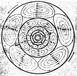 Солнечное окружение образовалось из дискообразной газовой туманности с m = 0,1 массы Солнца, перемешиваемой турбулентными вихрями. Между большими вихрями конденсируются планеты в виде шарикоподшипников, а малые планеты появляются от взрыва больших планет (рис. 19).